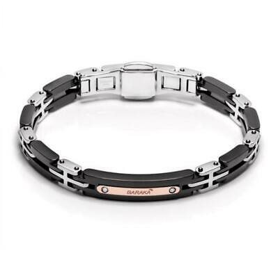 Bracciale da uomo realizzato in Oro rosa 750‰ e Ceramica nera High-Tech, impreziosito da due Diamanti bianchi P.Ct 4. Chiusura in Acciaio inossidabile. Bracciale maschile che fonde eleganza e stile moderno grazie all'abbinamento di Acciaio, Ceramica lucida e Oro 18 Carati. Riconoscibilità e valore artigianale sono dichiarati dalla firma Barakà posta al centro del gioiello. Made in Italy.