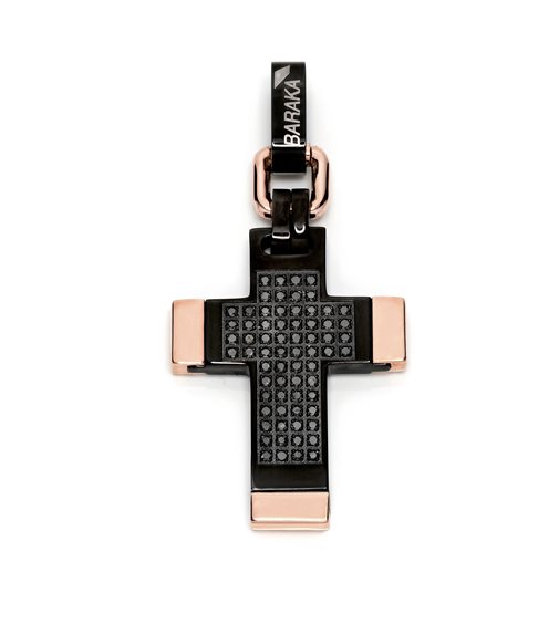 Croce in acciaio PVD nero e oro rosa con pavé di diamanti neri, creata artigianalmente con le più moderne tecnologie.