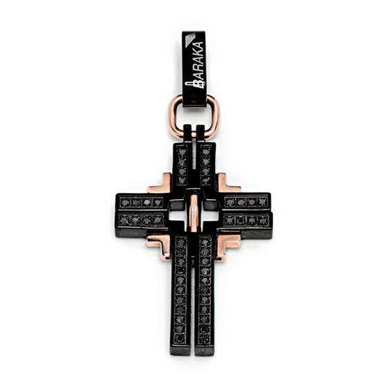 Pendente a forma di croce realizzato in Oro Rosè 750‰ e Acciaio PDV nero. Presenta i Diamanti neri da P.Ct. 42.