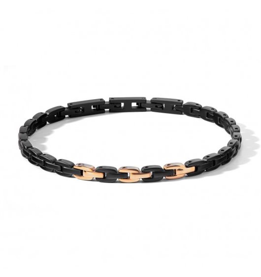 Braccialetto da uomo realizzato in acciaio anallergico con finitura nera; maglie rose gold. Lunghezza totale di 21,5 cm, regolabile fino a 18,6 cm. Chiusura con tre maglie rimovibili.