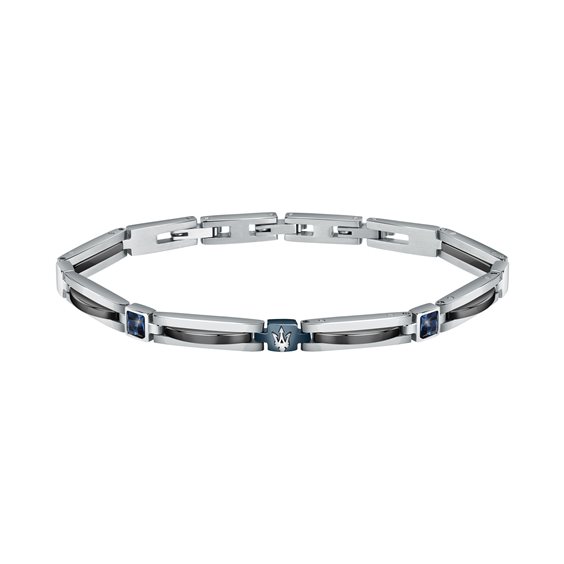 Braccialetto da uomo realizzato in acciaio anallergico con finitura lucida, elementi con trattamento ip blu e dettagli in ceramica nera. Logo blu su elemento centrale . Misura regolabile; chiusura con maglie rimovibili.