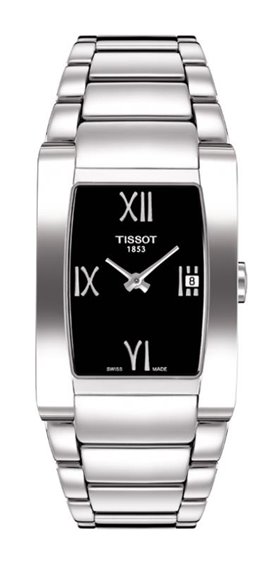 Orologio Tissot Generosi T-, donna. Cassa rettangolare 25X35mm in acciaio e cinturino in acciaio con chiusura a farfalla e pulsanti. Quadrante nero con datario a ore 3, movimento svizzero al quarzo, vetro zaffiro, impermeabile fino 3 atm. Completamente Swiss Made